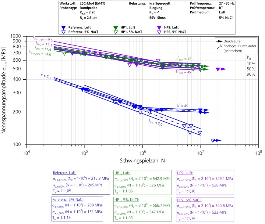 Im Rahmen des Forschungsprojektes konnte gezeigt werden, dass durch eine mit optimierten Verfahrensparametern durchgeführte induktive Randschichthärtung sowohl die Schwingfestigkeit als auch die Korrosionsschwingfestigkeit (korrosives Medium 5 %-NaCl Lösung) des Werkstoffes 25CrMo4 (EA4T) signifikant gesteigert werden konnte.