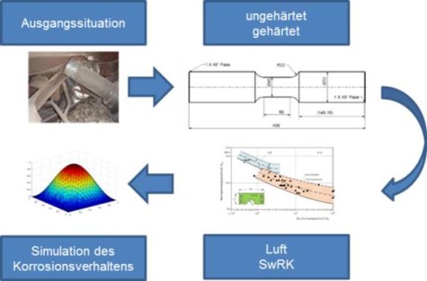 Neben einer rein mechanischen Beanspruchung unterliegen Radsatzwellen häufig witterungsbedingt einer gleichzeitigen zyklischen, mechanisch-elektrochemischen Komplexbeanspruchung (Schwingungsrisskorrosion). Insbesondere die Schwingungsrisskorrosion geht bei metallischen Werkstoffen, auch bei nichtrostenden Stahlqualitäten, mit einem Schwingfestigkeitsabfall von teilweise mehr als 50% einher. Für die Verbesserung der Schwingfestigkeitseigenschaften sind technologische Verfahren zur Randschichtverfestigung besonders wirksam, aber in den Fertigungsprozess von Radsatzwellen derzeit nicht integriert. Die Wirksamkeit mechanisch eingebrachter Druckeigenspannungen durch Festwalzen oder Strahlen, auch zur Erhöhung der Korrosionsschwingfestigkeit, sind bereits bekannt. Hingegen sind die thermo-chemischen (z.B. Nitrieren) oder thermischen Verfahren (z.B. Induktionshärten) bezüglich ihrer Möglichkeit zur Steigerung der Schwingfestigkeit von Stählen in korrosiven Umgebungsmedien noch nicht ausreichend qualifiziert.