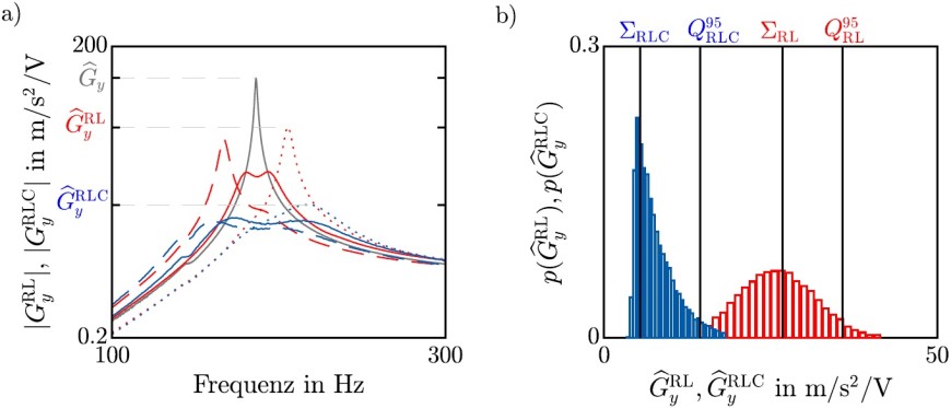 There, the influence of epistemic data uncertainty realized by the variation of static axial loads on the vibration attenuation via piezoelectric shunt damping is investigated. The variation of static loads results in a decrease of the first resonance frequency for compressive loads as well as an increase for tensile loads, figure 2a). Furthermore, aleatoric uncertainty from the manufacturing and assembly of the piezo-elastic support as well as from the variation of shunt components and transducer parameters for RL- and RLC- shunts is quantified and investigated using a Monte-Carlo simulation, figure 2b). For both, experimental and numerical investigations, the RLC-shunt achieves a higher vibration attenuation with lower deviation than the RL-shunt.